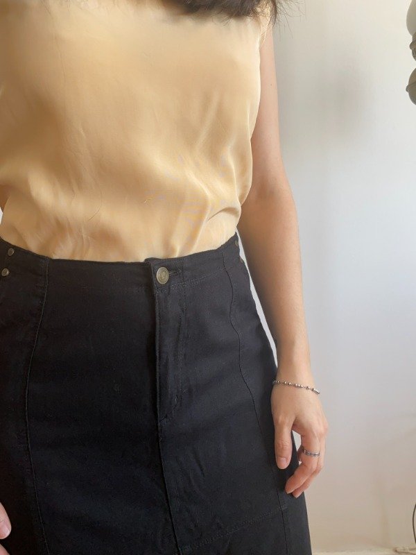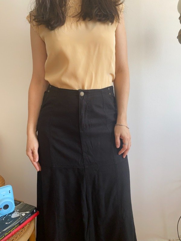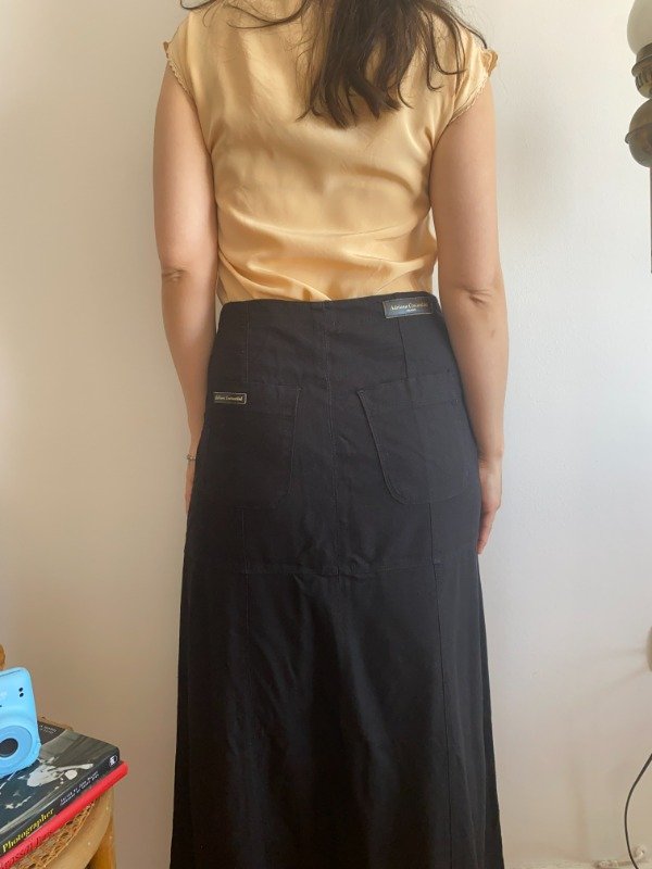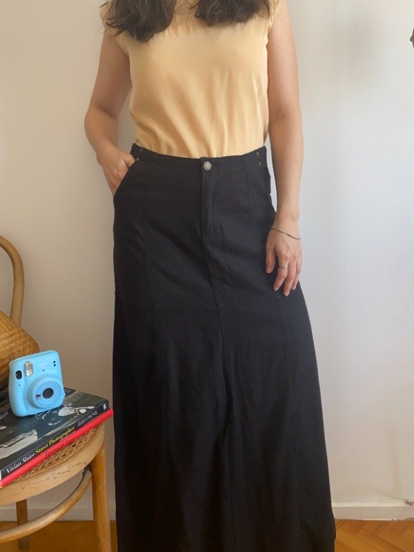 Marca Adriana Constantini. El género es algodón, suave. Es una falda larga, con bolsillitos. Prende con un cierre y botón en el frente. Divina.