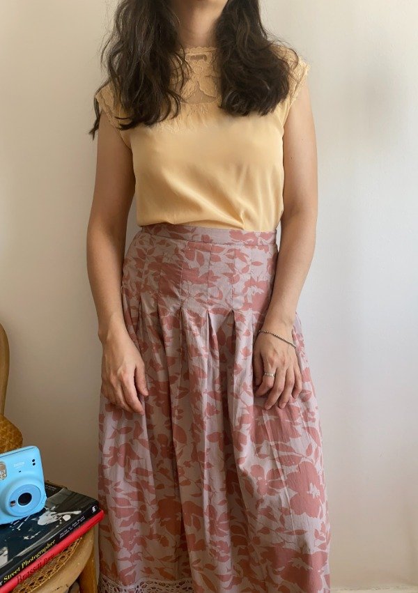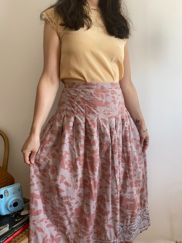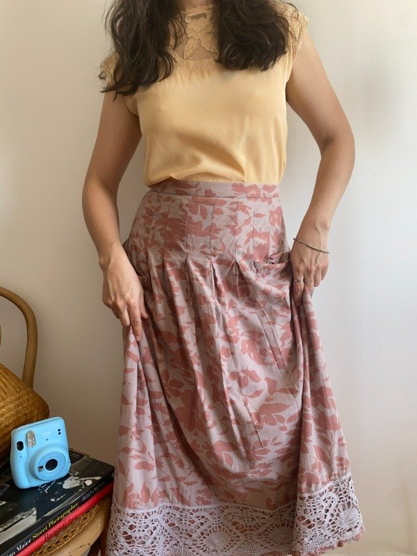 De nuestra historia reciente. El género es algodón, y en el ribete, tiene detalles de encaje también de algodón. Está forrado por dentro, y el género es un algodón bien finito y liviano. Tiene pinzas que nacen de la cadera. Cierre de costado para prenderlo. Una buena cantidad de tela y es muy fresca!