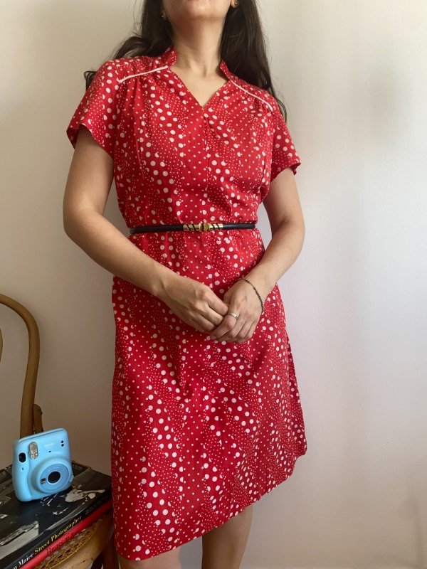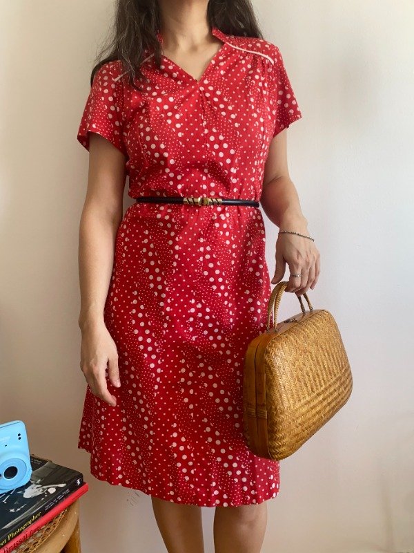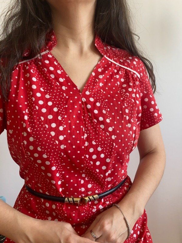 Década del '70. El género es algodón el de antes, liviano. Manguitas japonesas. Tiene cierre de costado para prenderlo. Divino.