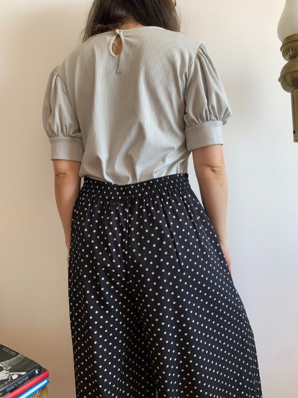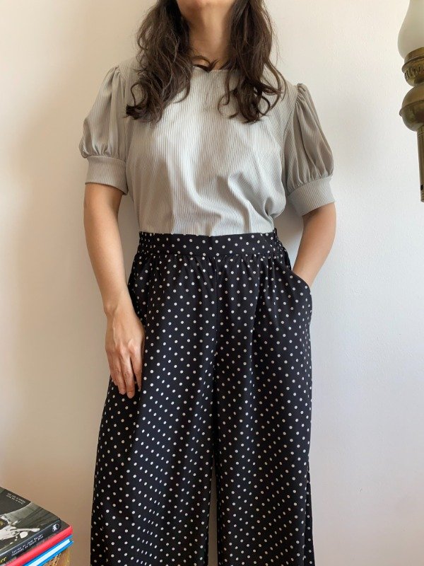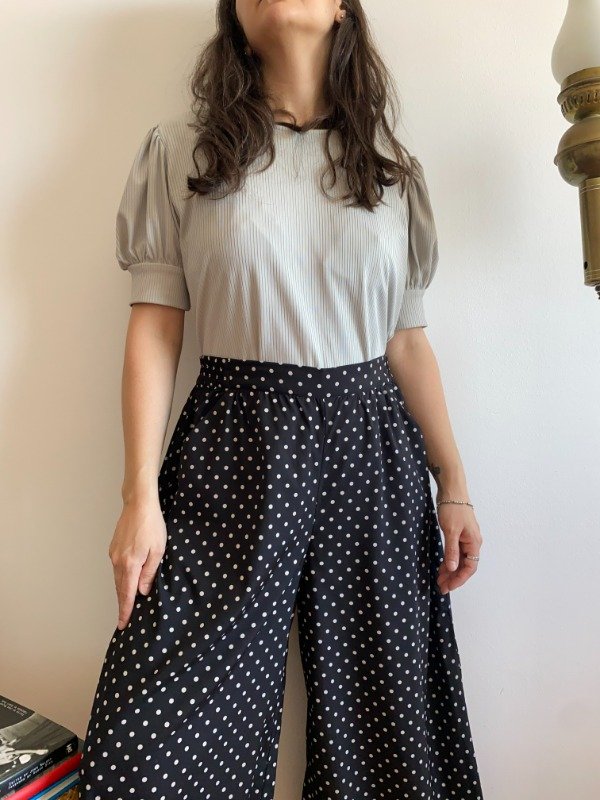 De nuestra historia reciente. Es un pantalón sintético, suave y liviano. Botamanga amplia, bien cómodo para caminar. Bolsillos. Por detrás tiene un poco de elástico para mayor comodidad al ponerlo. Divino.