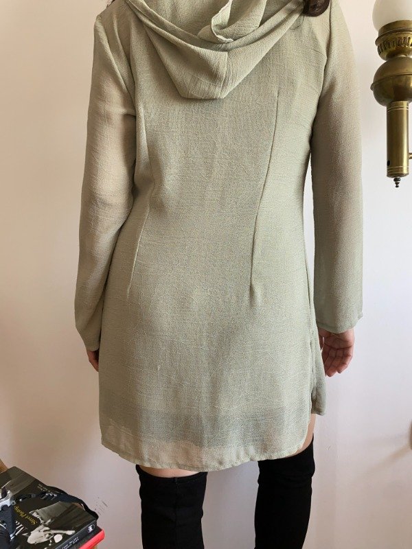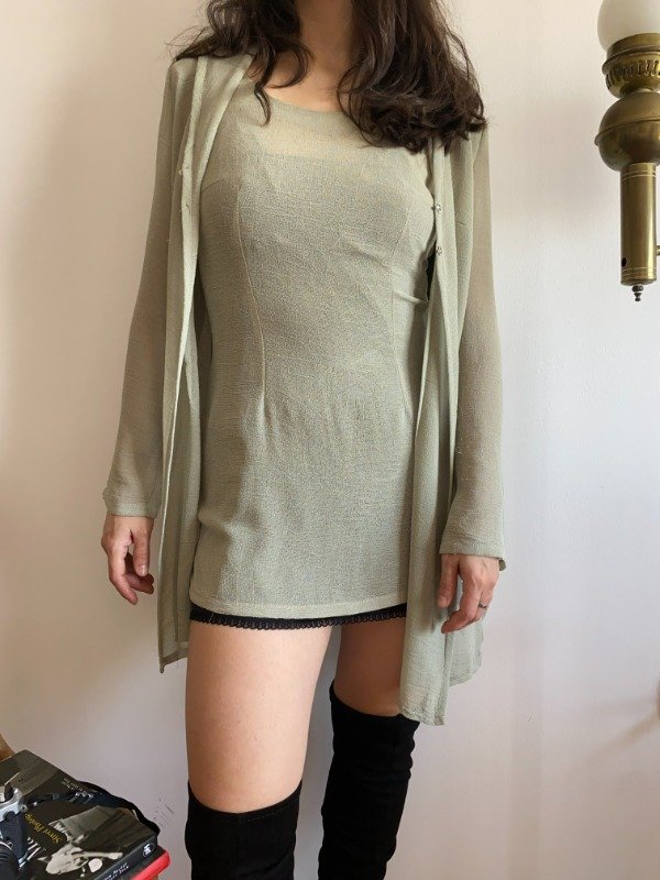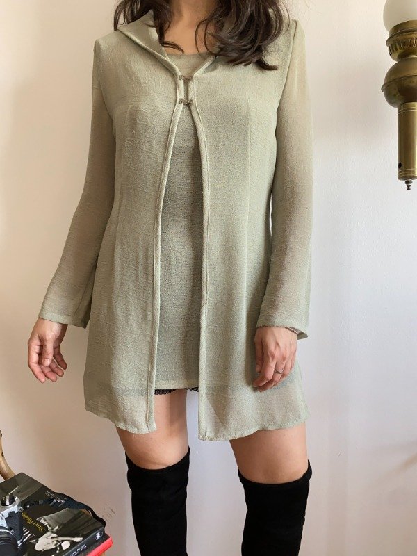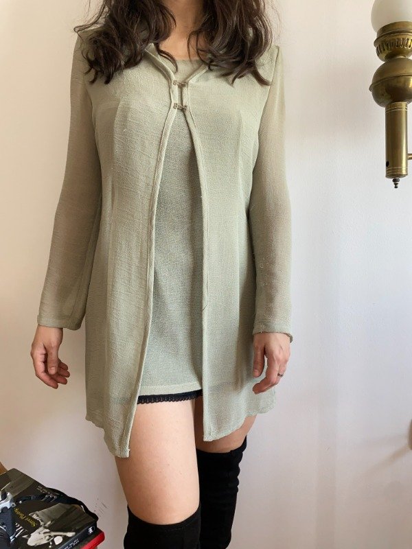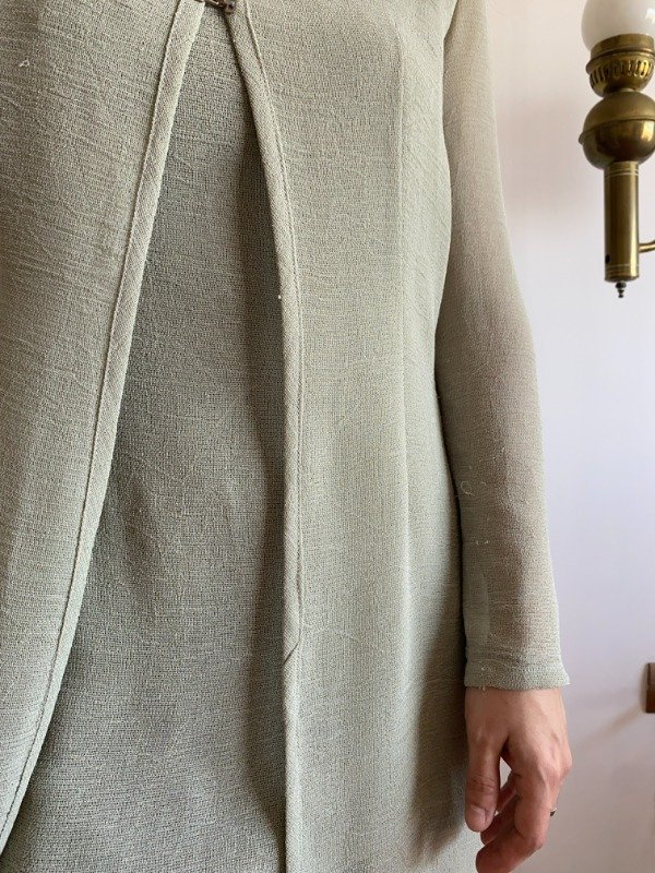 Década del '90. El género es rayón, bien fino y con una buena caída. El set consiste en una remerita y vestidito corto y un saquito con capucha. La remerita tiene pinzas que arman la silueta, breteles dobles. Es bastante transparente, es para usarla con algo abajo. El saquito es un poco mas largo, tiene pinzas también. Capucha. Prende con dos ganchitos metálicos en el frente. Un primor.
