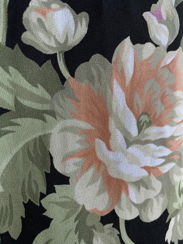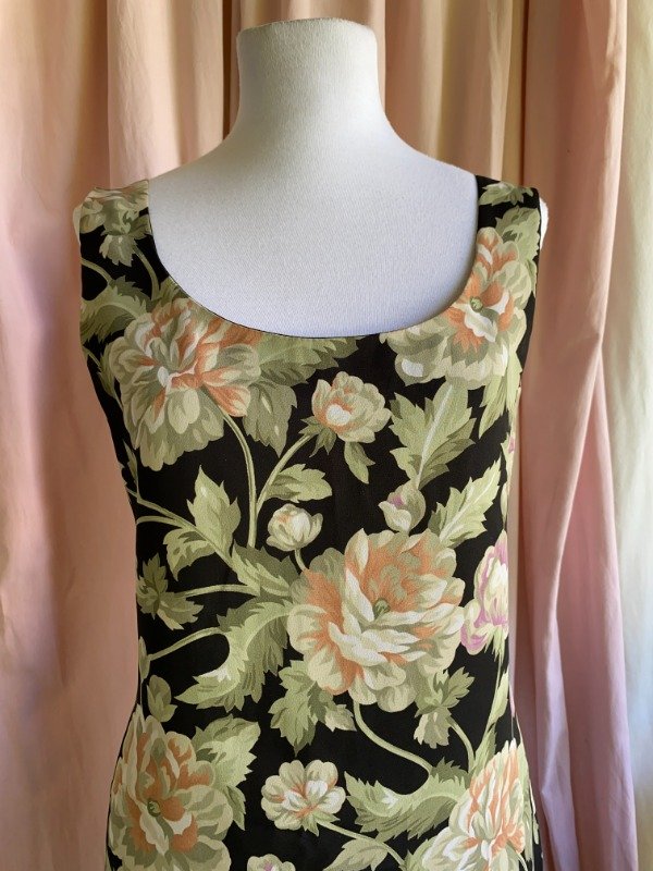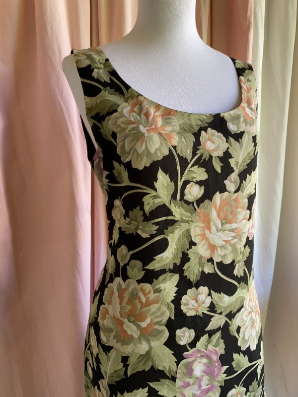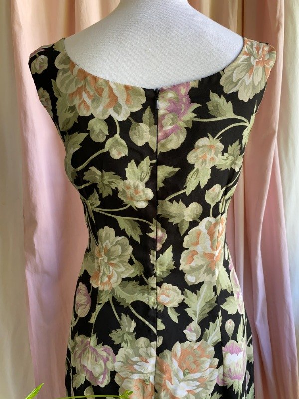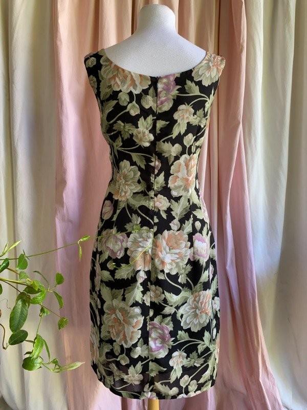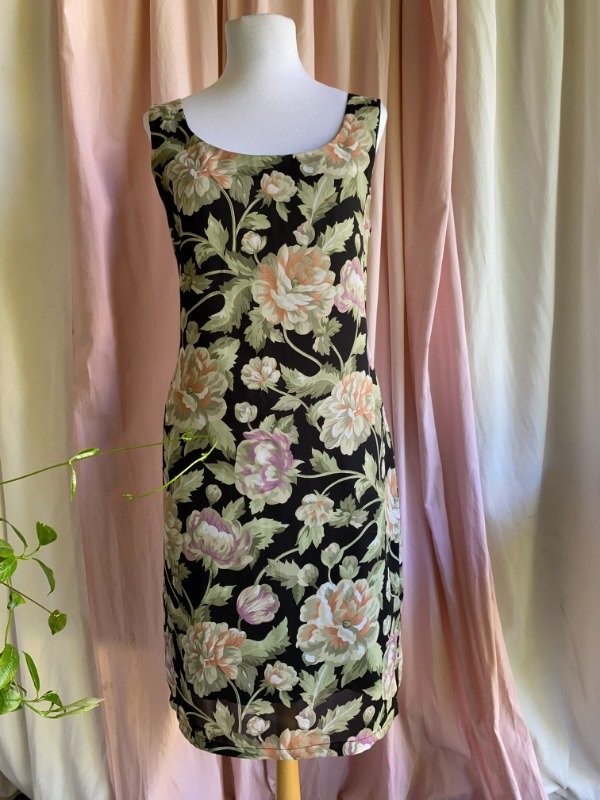 Vestido década del '90, marca Matisse. Es un vestido de gasa, forrado en tafeta. El modelo es al cuerpo, con pincitas que marcan la silueta en ambas caras. Cuenta con un cierre escondido por detrás. Hermoso estampado de flores.