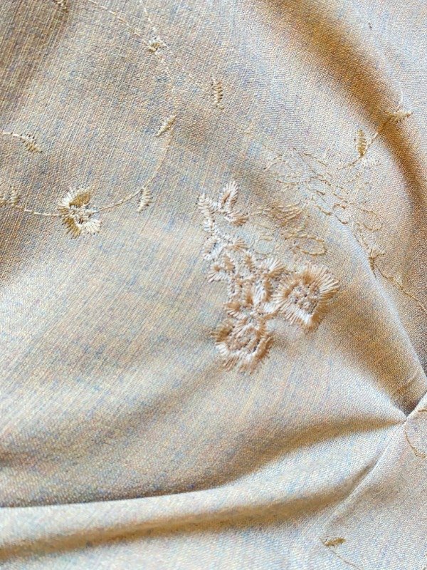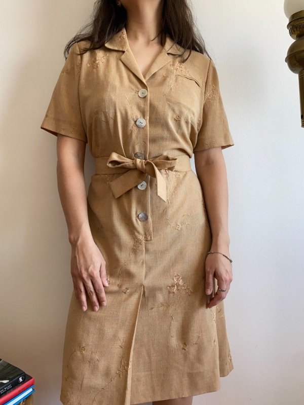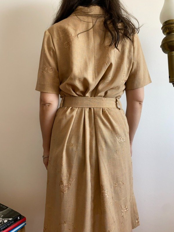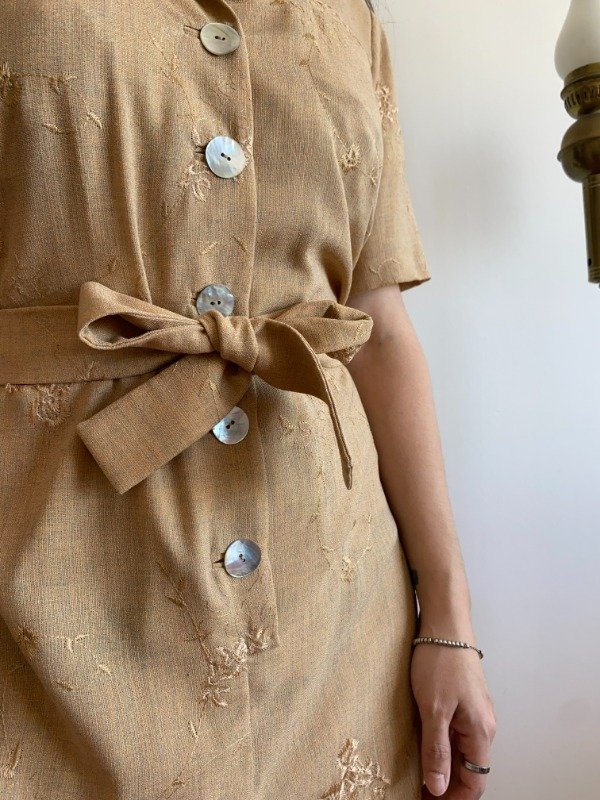 Tipico chemisse vintage. El género es sintético, todo bordado con flores y ramas. A su vez, es un color beige, pero tiene una especie de tornasol celeste. Único. Botones nacarados funcionales hasta la cintura. Bolsillito superior. Tiene un lazo del mismo género para ajustar en la cintura. Tajo en la falda para mas comodidad al caminar. Una belleza.