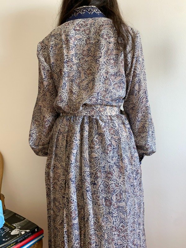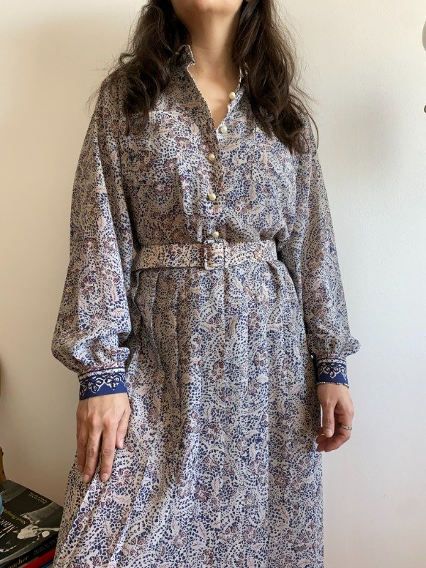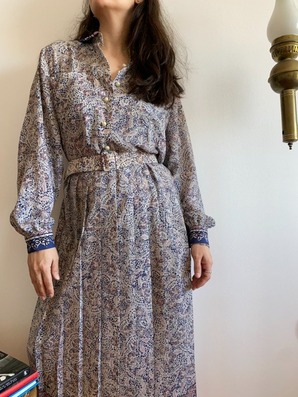 Década del '70. Es un vestido de gasa sintética, súper liviano. Cuenta con botones tipo perlitas en el frente funcionales para abrochar. Corte en la cintura, donde nacen tablitas. Viene con su cinto original para ajustar. Mangas abullonadas en los puños. Bolsillitos en el frente. Hermoso estampado tipo mosaico, con florcitas bordeaux.